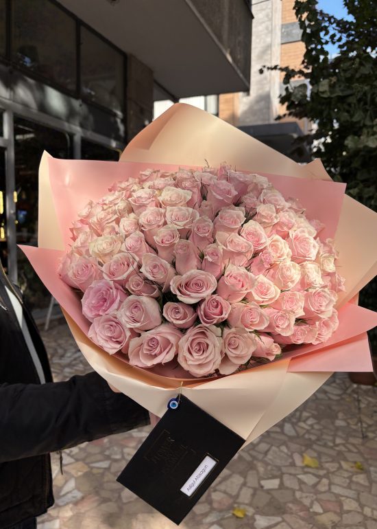 An exquisite bouquet meticulously crafted with 101 pink premium imported roses, each carefully selected for their unparalleled beauty and elegance. Lovingly arranged and wrapped with precision, this luxurious creation radiates sophistication and charm, making it the perfect choice for any special occasion. With its vibrant colors and delicate fragrance, this masterpiece is designed to leave a lasting impression and convey heartfelt emotions in the most stunning way possible.