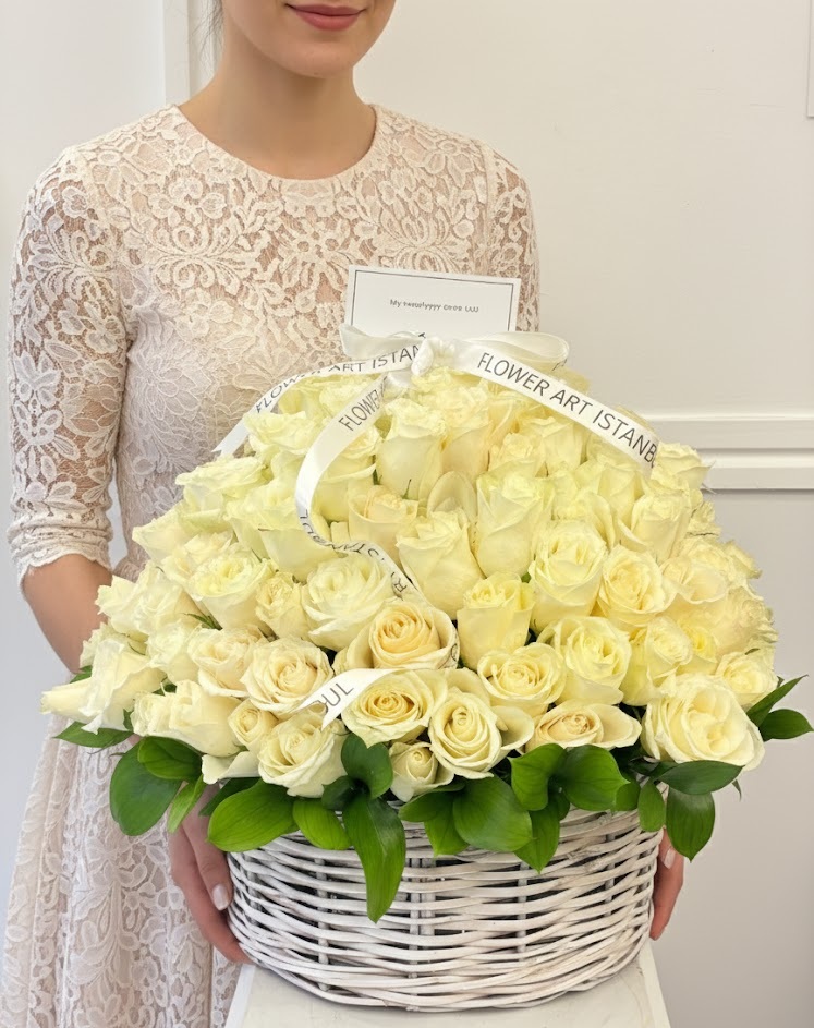 A stunning arrangement of 151 white roses, elegantly presented in a classic white basket.
