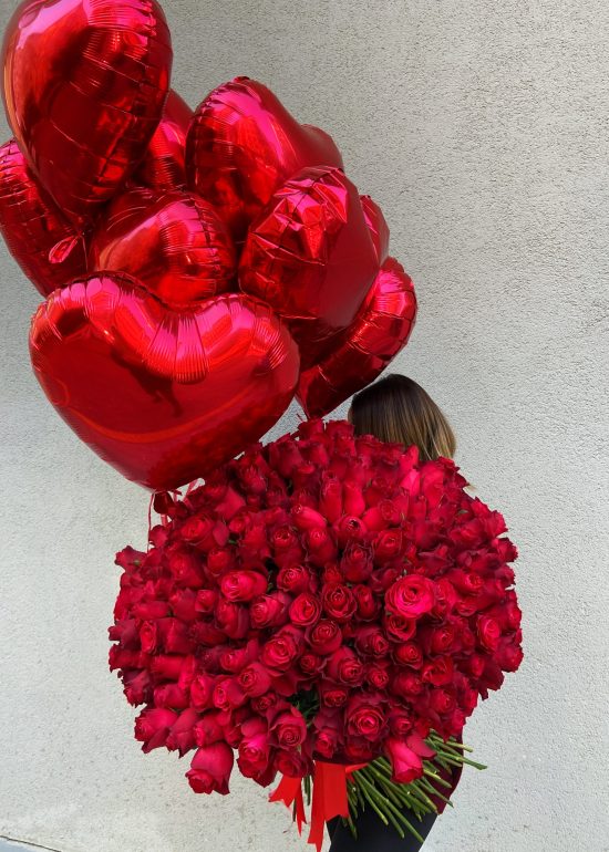 250 Red Roses and 10 Flying Heart Balloons