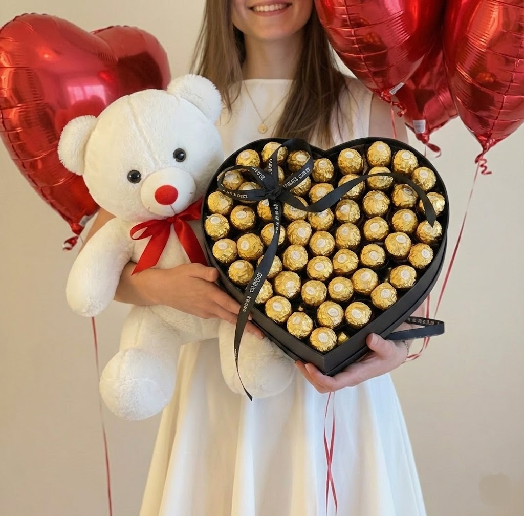4x Heart Ballons, 50cm white bear with red ribbon and a heart-shaped box carefully filled with 48-51 Ferrero Rocher chocolates, this elegant gift is perfect for adding a sweet touch to your special occasions. It’s a wonderful choice to bring joy to your loved ones and create an unforgettable surprise!
