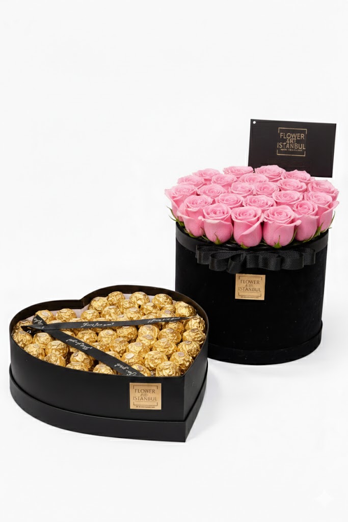 21-23 Premium Pink Roses in a velvet box and heart-shaped box carefully filled with Ferrero Rocher chocolates (45-50) pieces , this elegant gift is perfect for adding a sweet touch to your special occasions. It’s a wonderful choice to bring joy to your loved ones and create an unforgettable surprise!