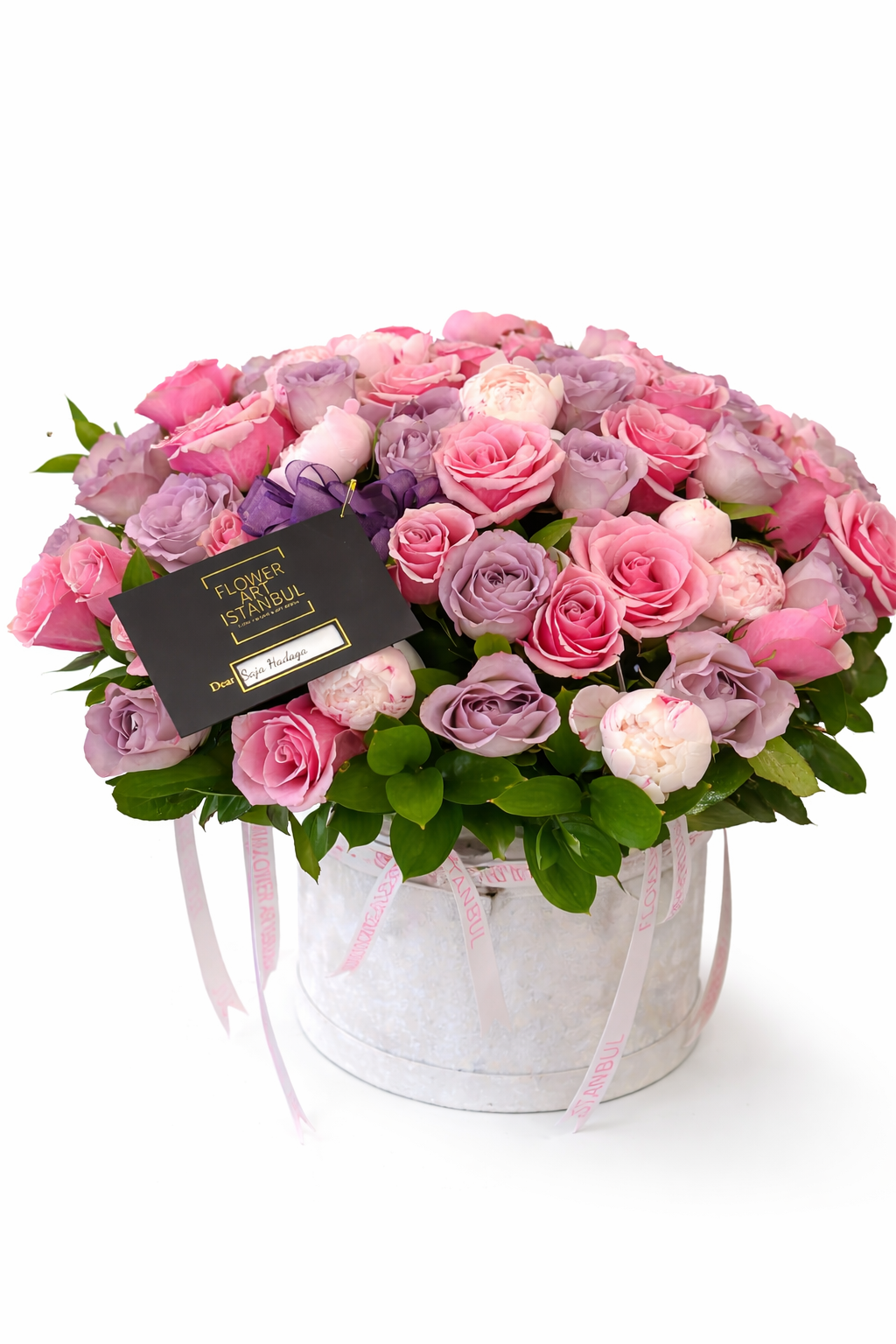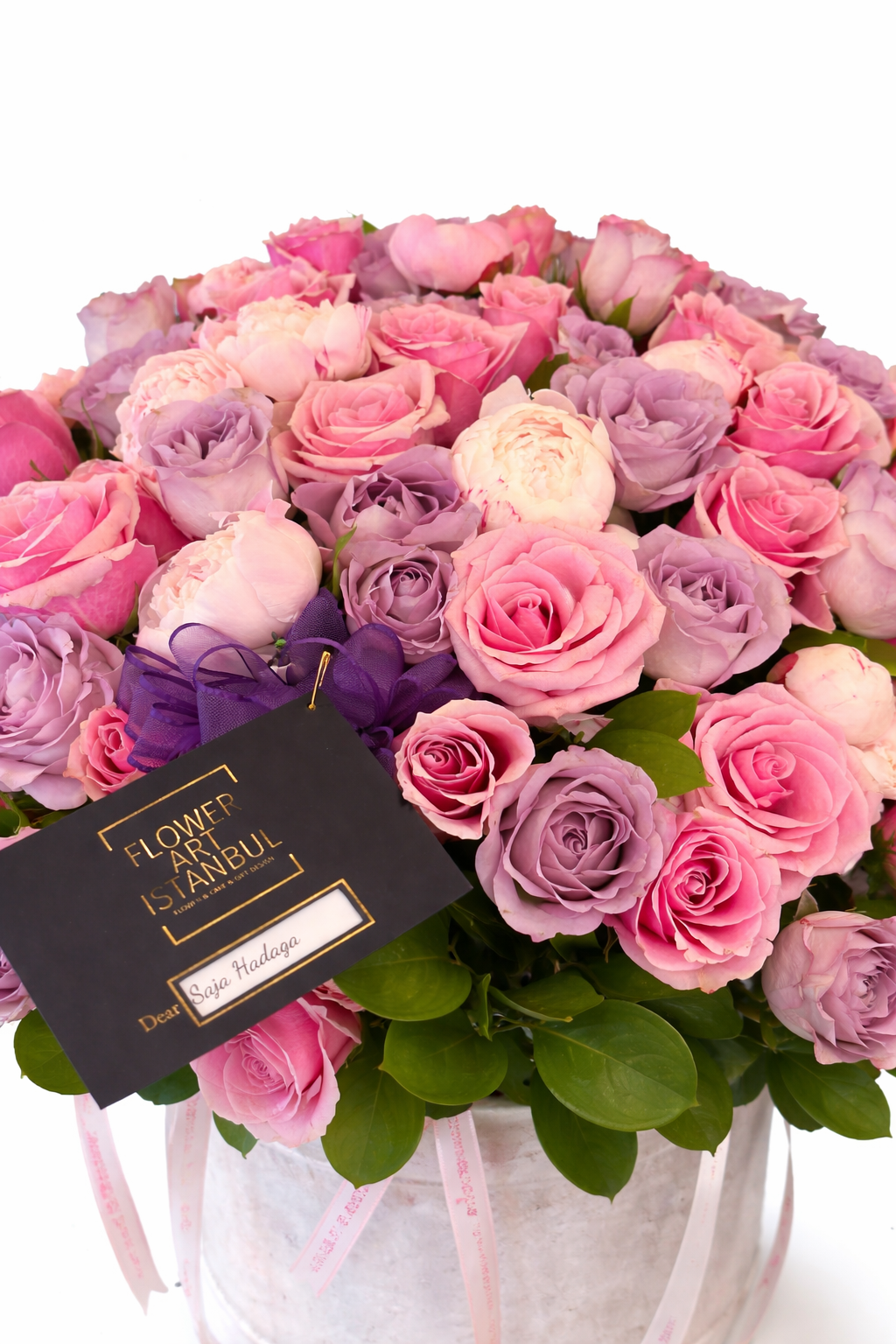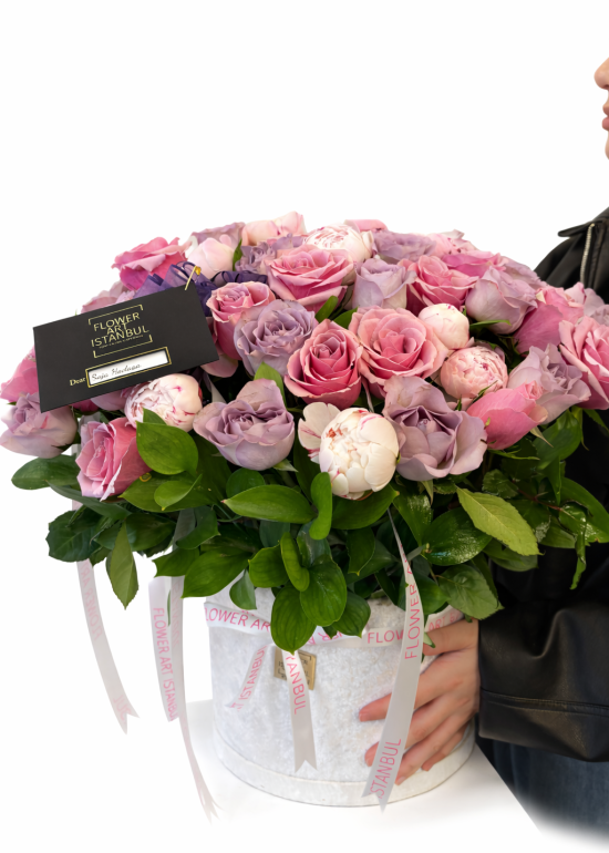 Pink roses symbolize admiration, love, and tenderness, while purple roses add a touch of charm, mystery, and refined beauty. The pink peonies complete the design with their lush, cloud-like petals, creating a feeling of abundance and premium sophistication.