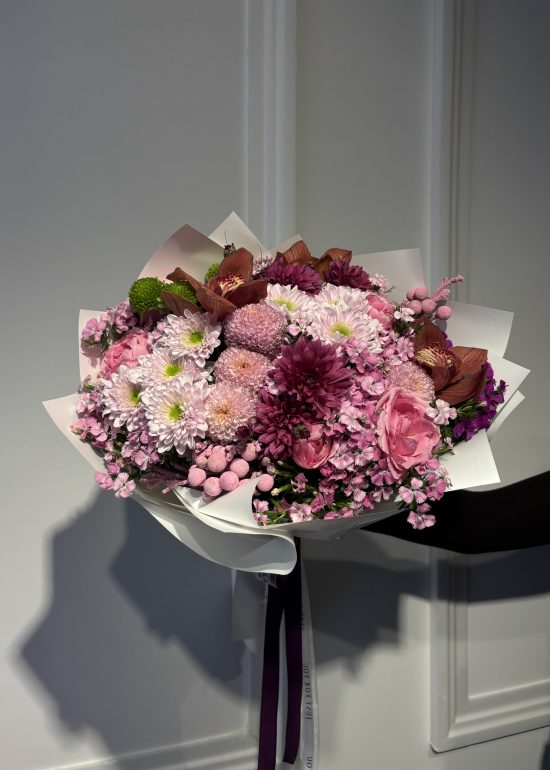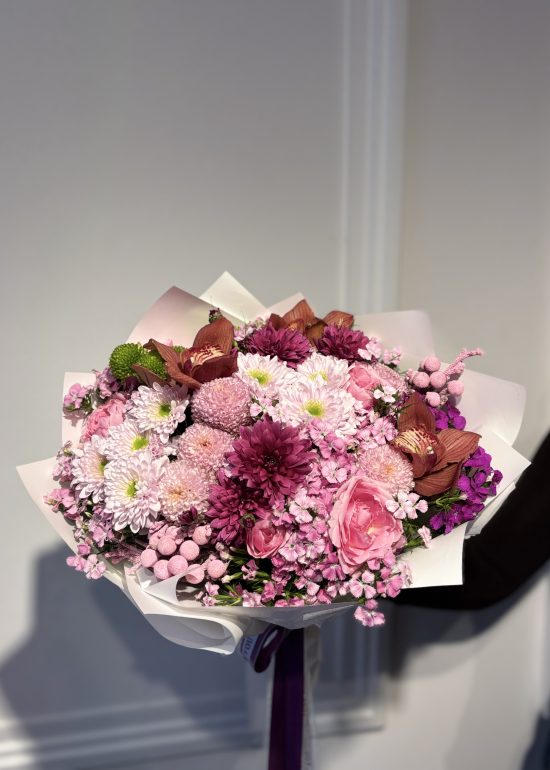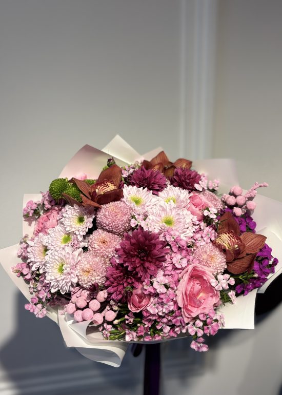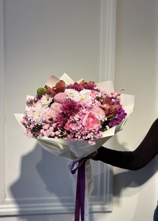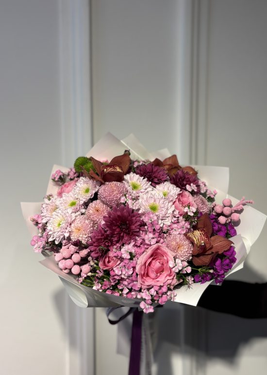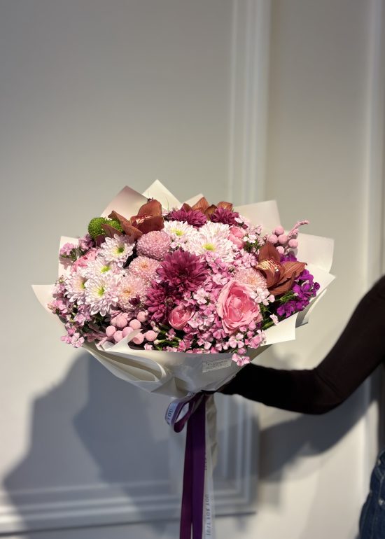 A lush bouquet featuring 5 pink roses and 5 Holland chrysanthemums, elegantly accented with seasonal blooms.