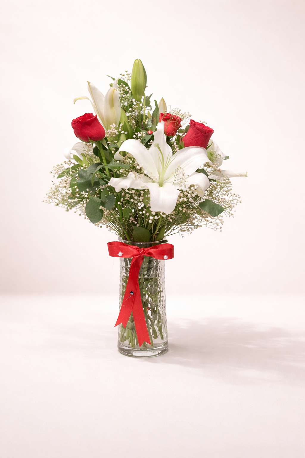This exquisite arrangement is a perfect harmony of elegance and indulgence. Featuring one majestic Casablanca lily and three vibrant red roses, artistically arranged in a modern glass vase, this design captures timeless beauty and sophistication.
