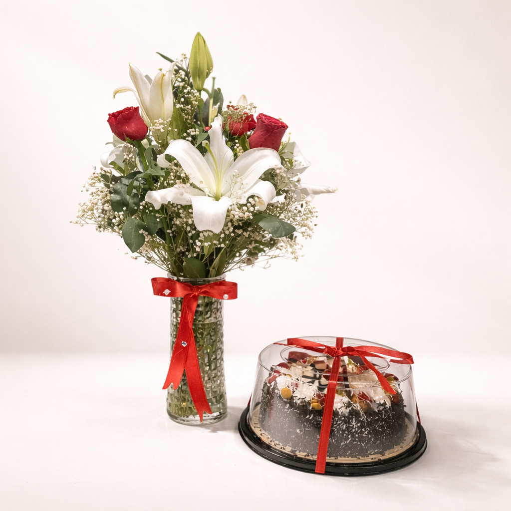 Each bouquet is thoughtfully prepared by our expert florists, using the freshest flowers of the day to ensure long-lasting beauty. The delicious cake adds a sweet finishing touch, making it a complete surprise filled with both emotion and flavor.