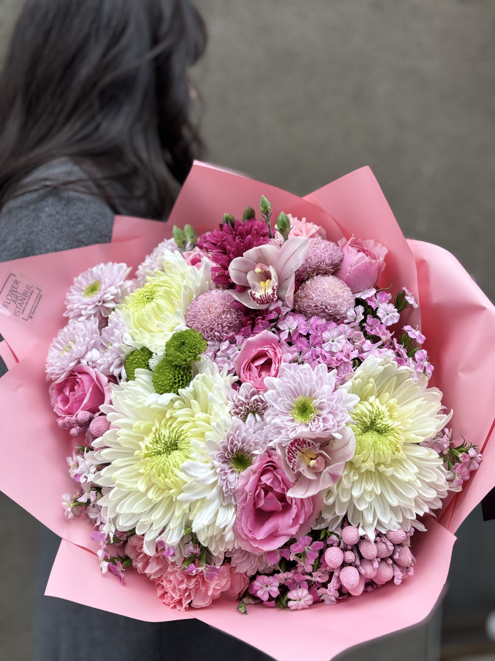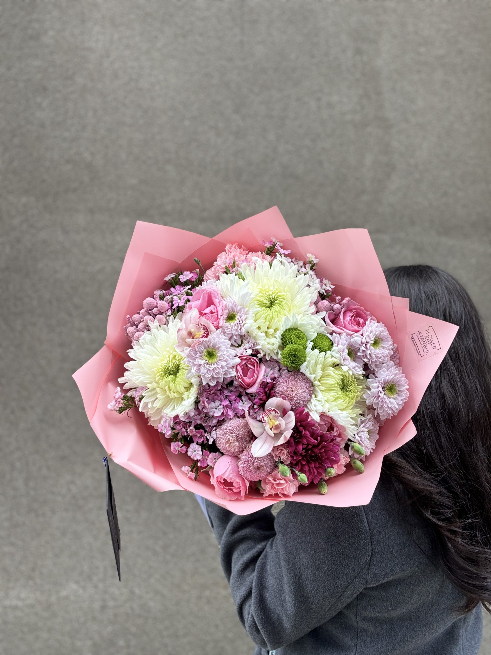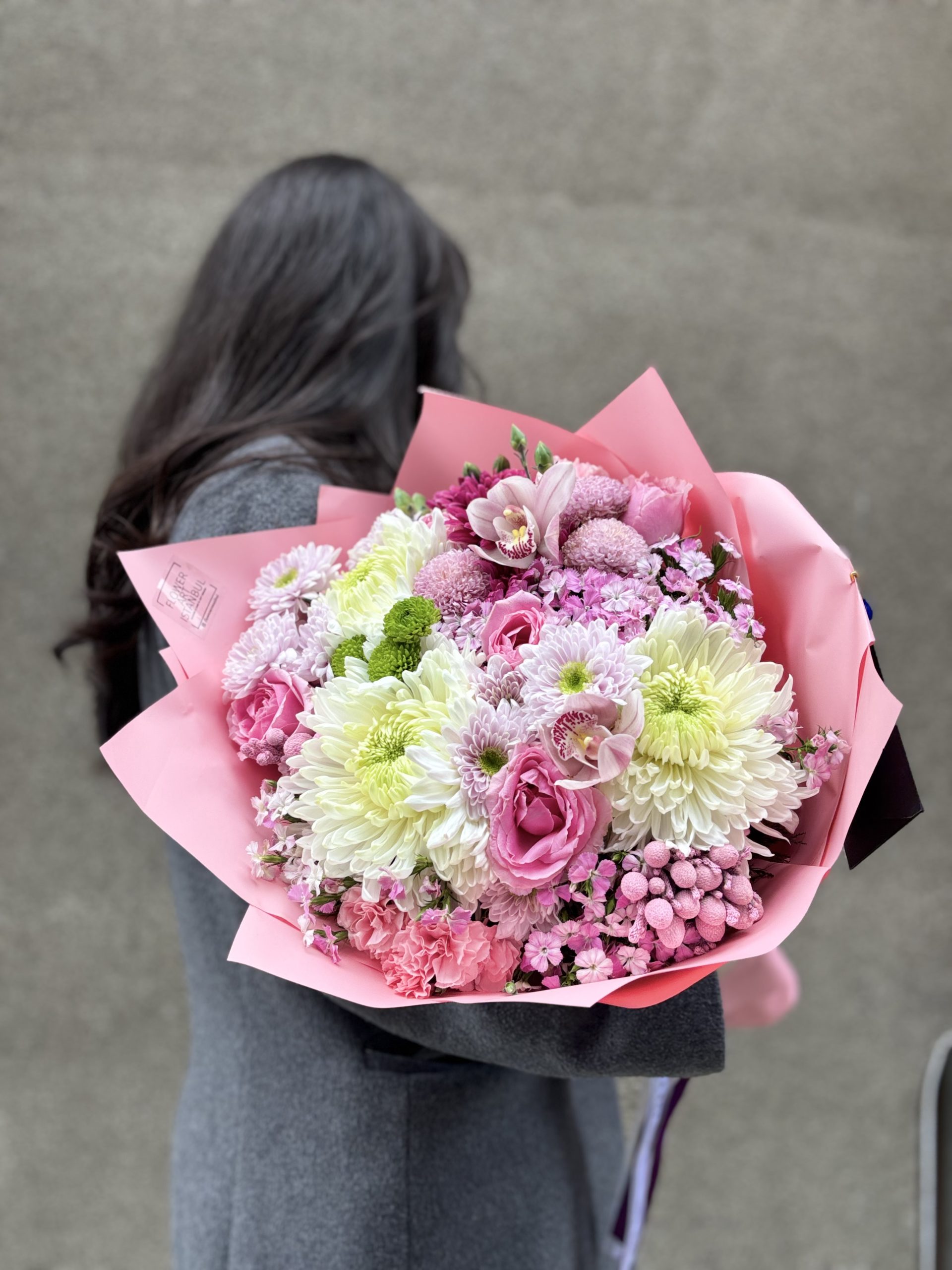 Wrapped in soft shades of pink, this elegant bouquet is a graceful celebration of color and charm. Carefully arranged with exotic Cymbidium orchids, vibrant roses, delicate daisies, majestic Anastasia blooms, and a touch of seasonal flowers, this bouquet is designed to enchant at first glance.