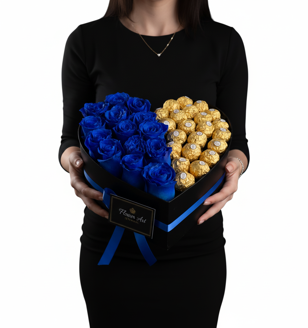It has been carefully designed with the most exquisite 17-19 premium blue roses. Inside the elegant black velvet box, there is a special water-absorbing sponge and nourishing water, ensuring that your roses stay fresh for a long time without the need for a vase. To make it even more delightful, 25 Ferrero Rocher chocolates were added.