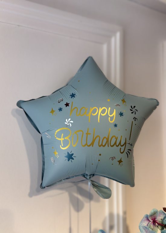 A graceful composition of 4 delicate blue orchid stems arranged in a sleek, high-end pot. Finished with a soft blue balloon for a modern, fresh accent. Ideal for tasteful interiors and premium gifting.