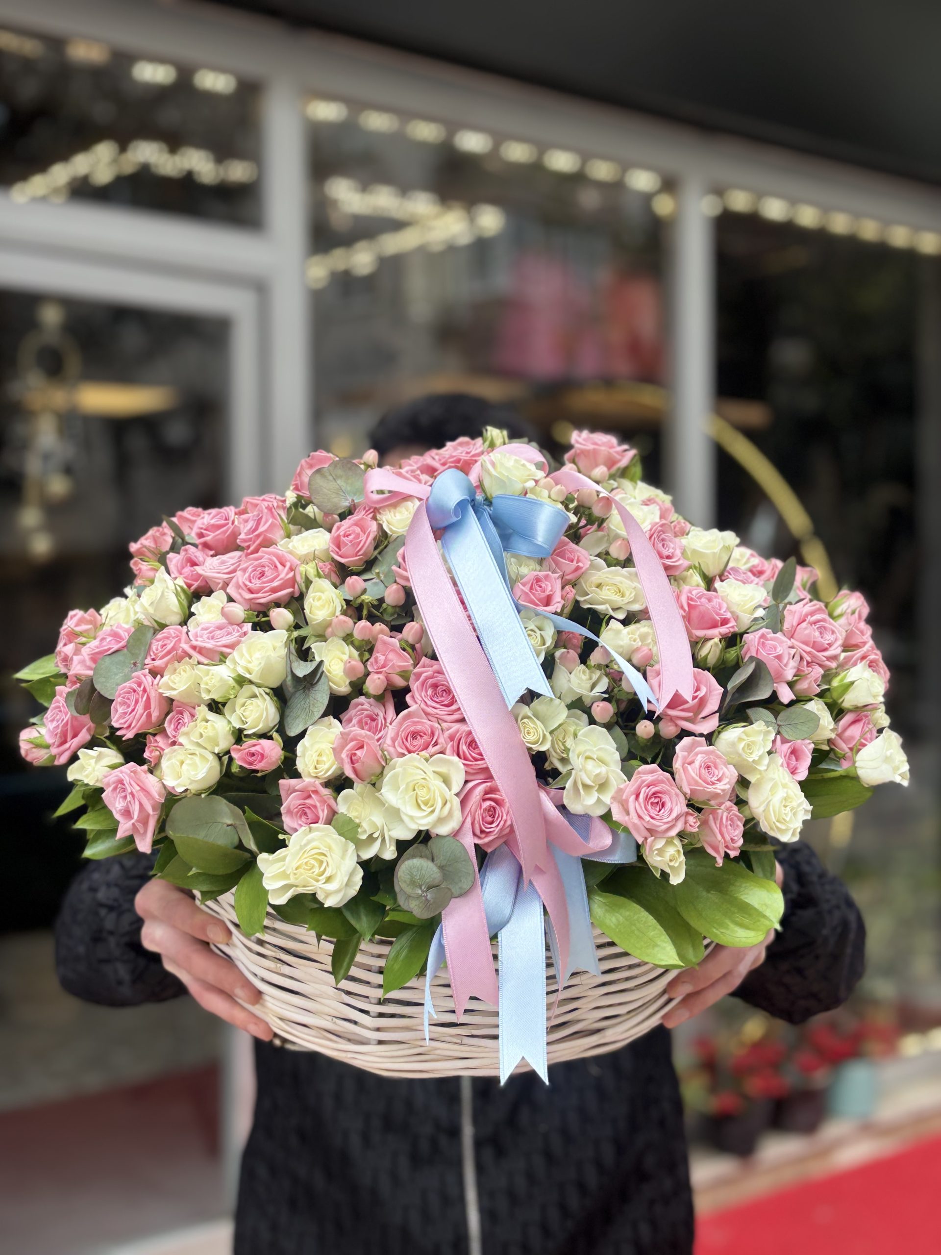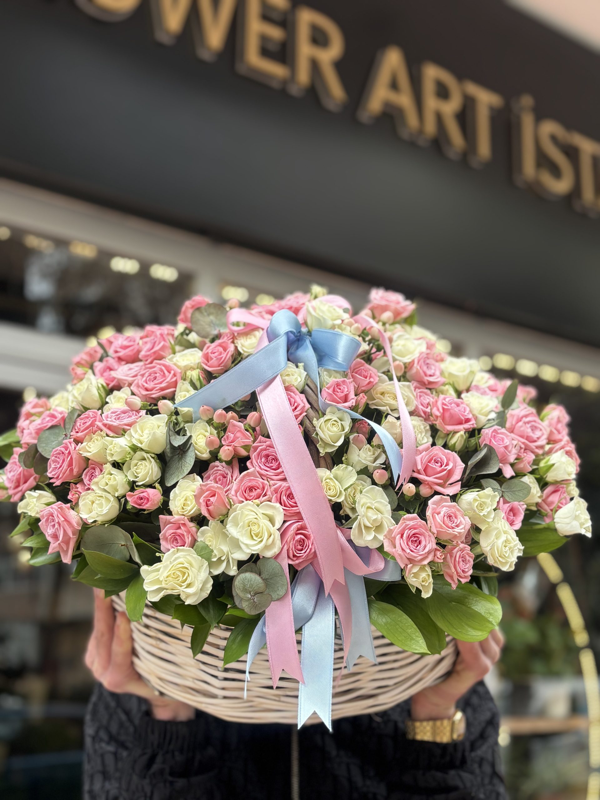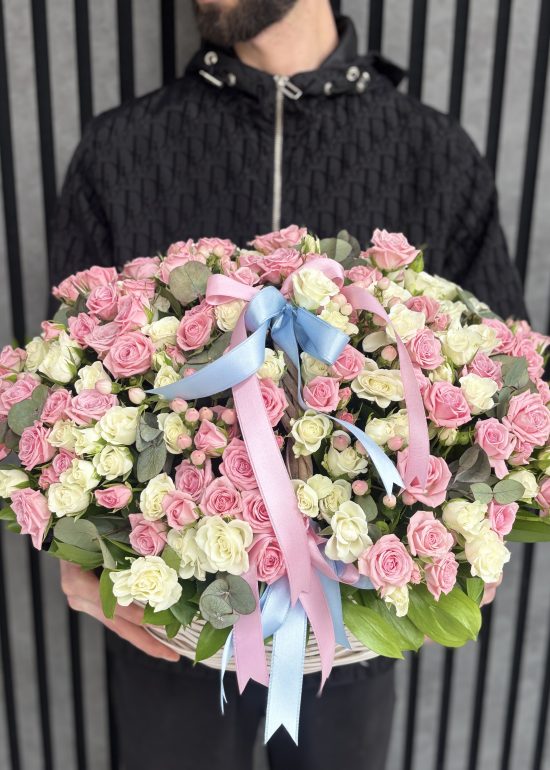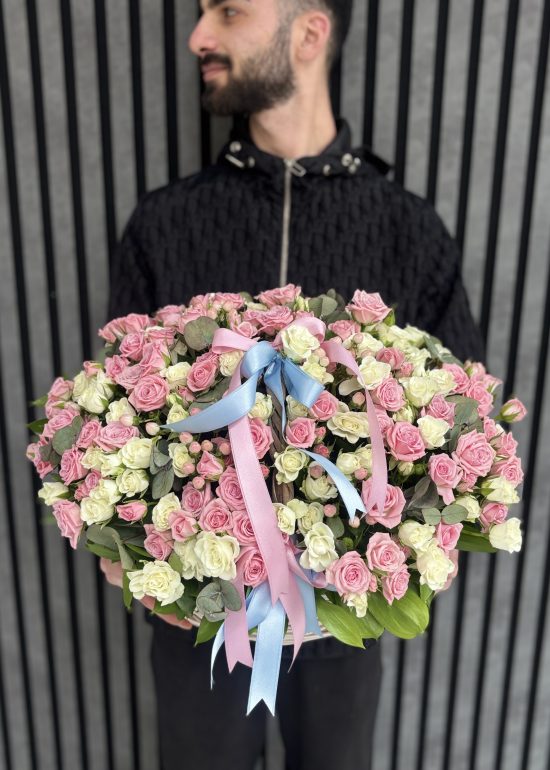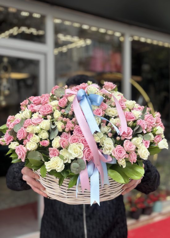 A luxurious basket arrangement prepared with approximately 60–65 stems of premium pink and white spray roses. Designed with a soft and elegant color harmony, this stunning floral basket is perfect for birthdays, anniversaries, celebrations, or sending a heartfelt gesture in Istanbul.