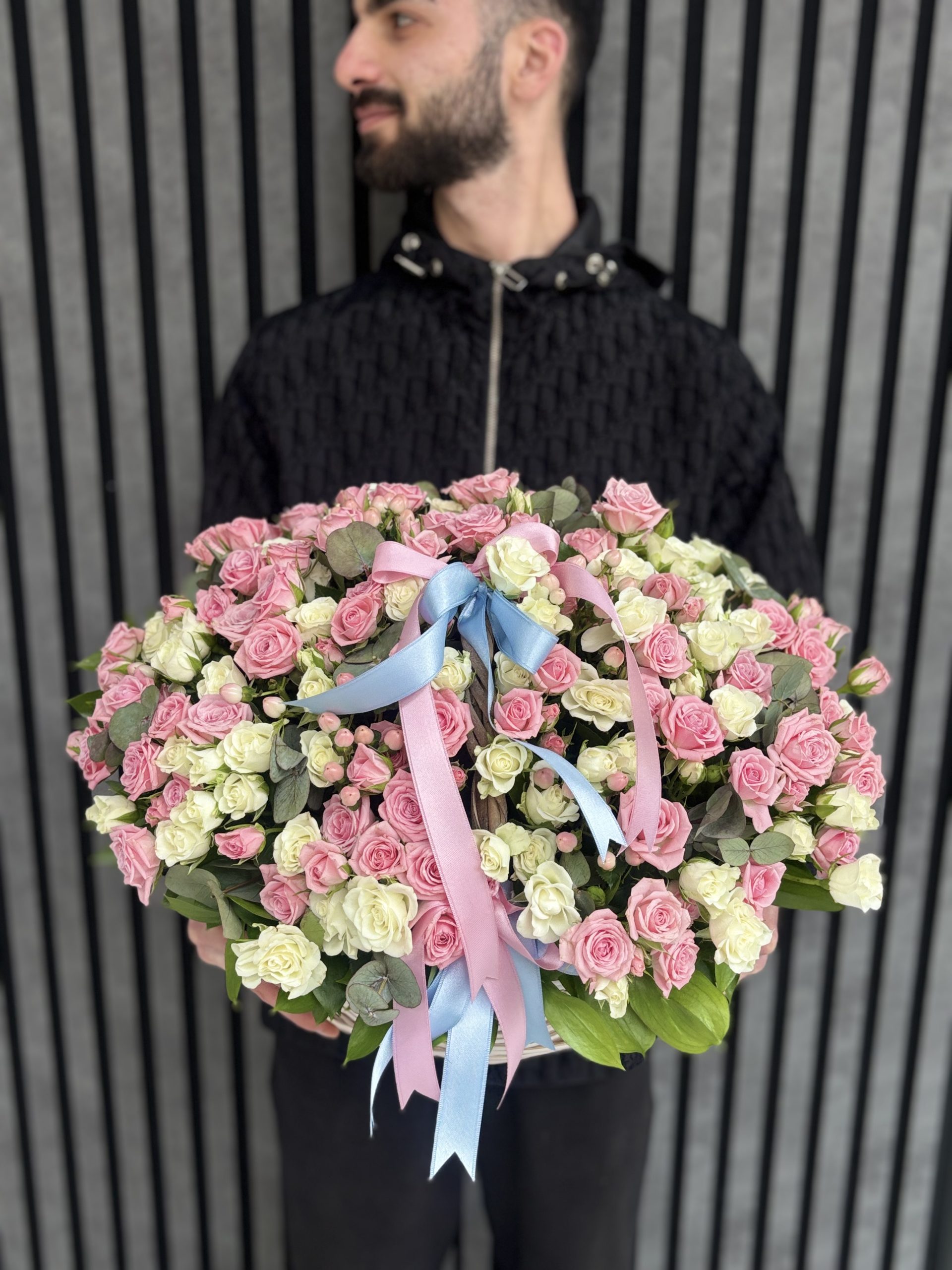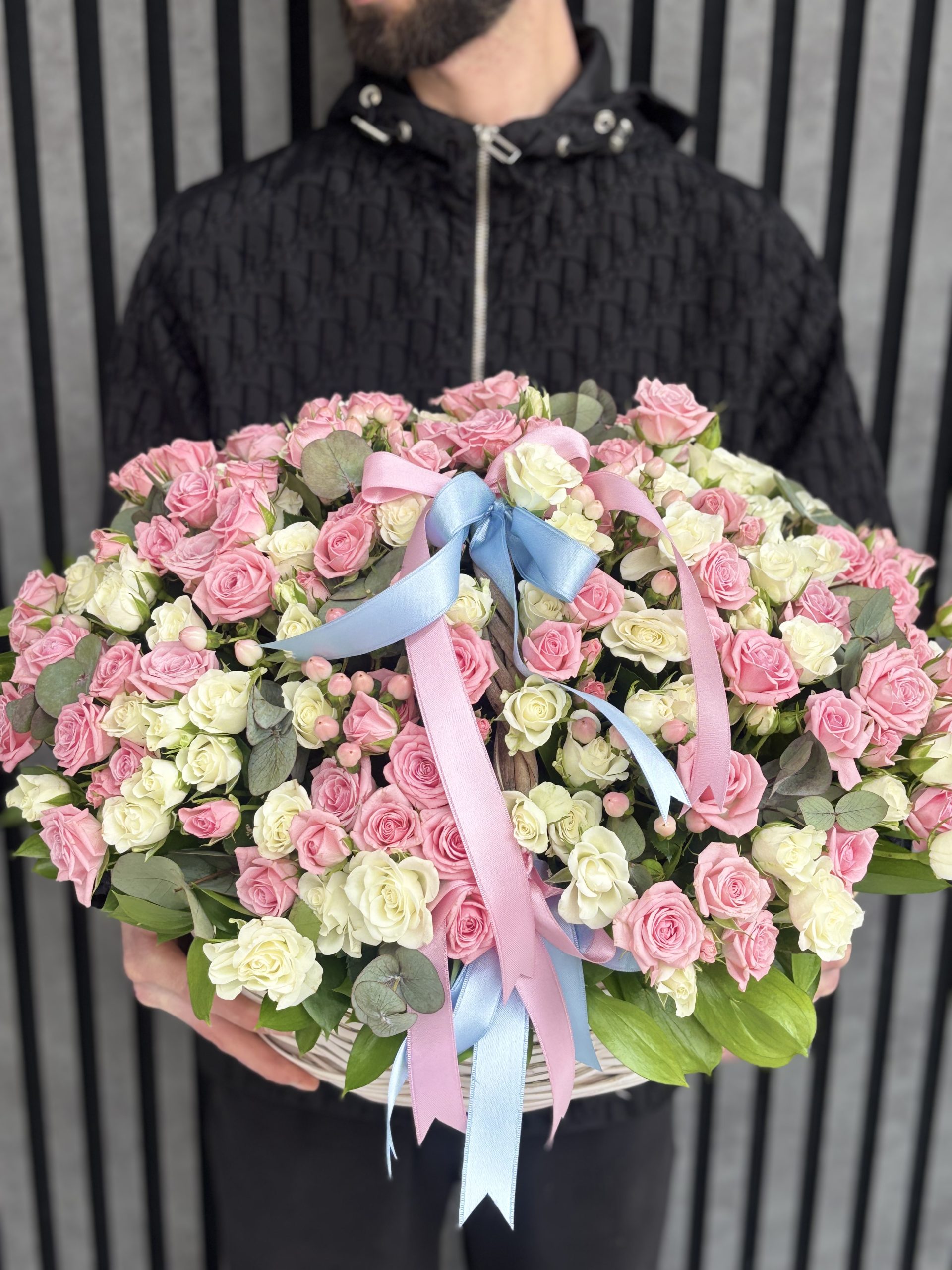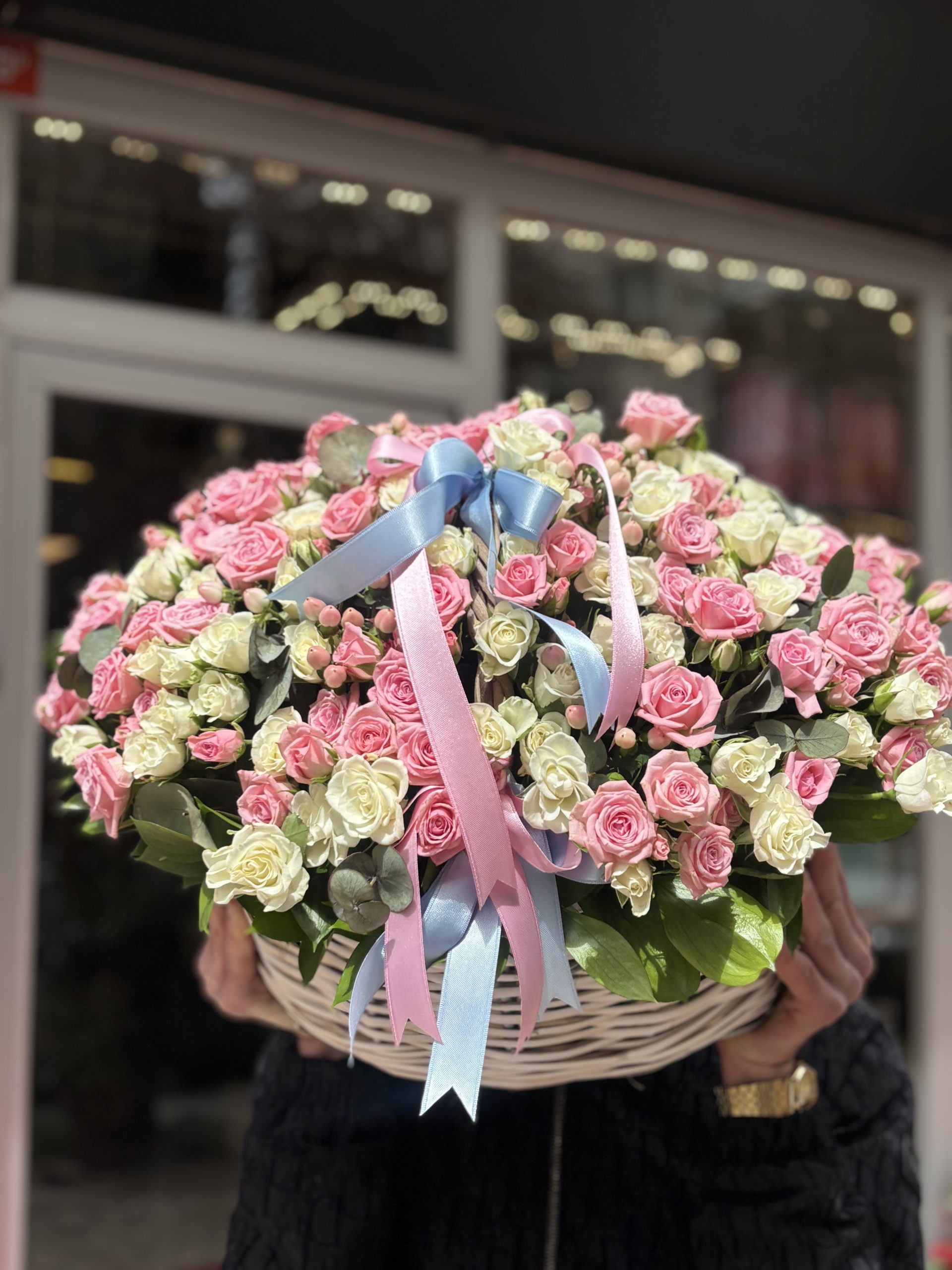 A luxurious basket arrangement prepared with approximately 60–65 stems of premium pink and white spray roses. Designed with a soft and elegant color harmony, this stunning floral basket is perfect for birthdays, anniversaries, celebrations, or sending a heartfelt gesture in Istanbul.