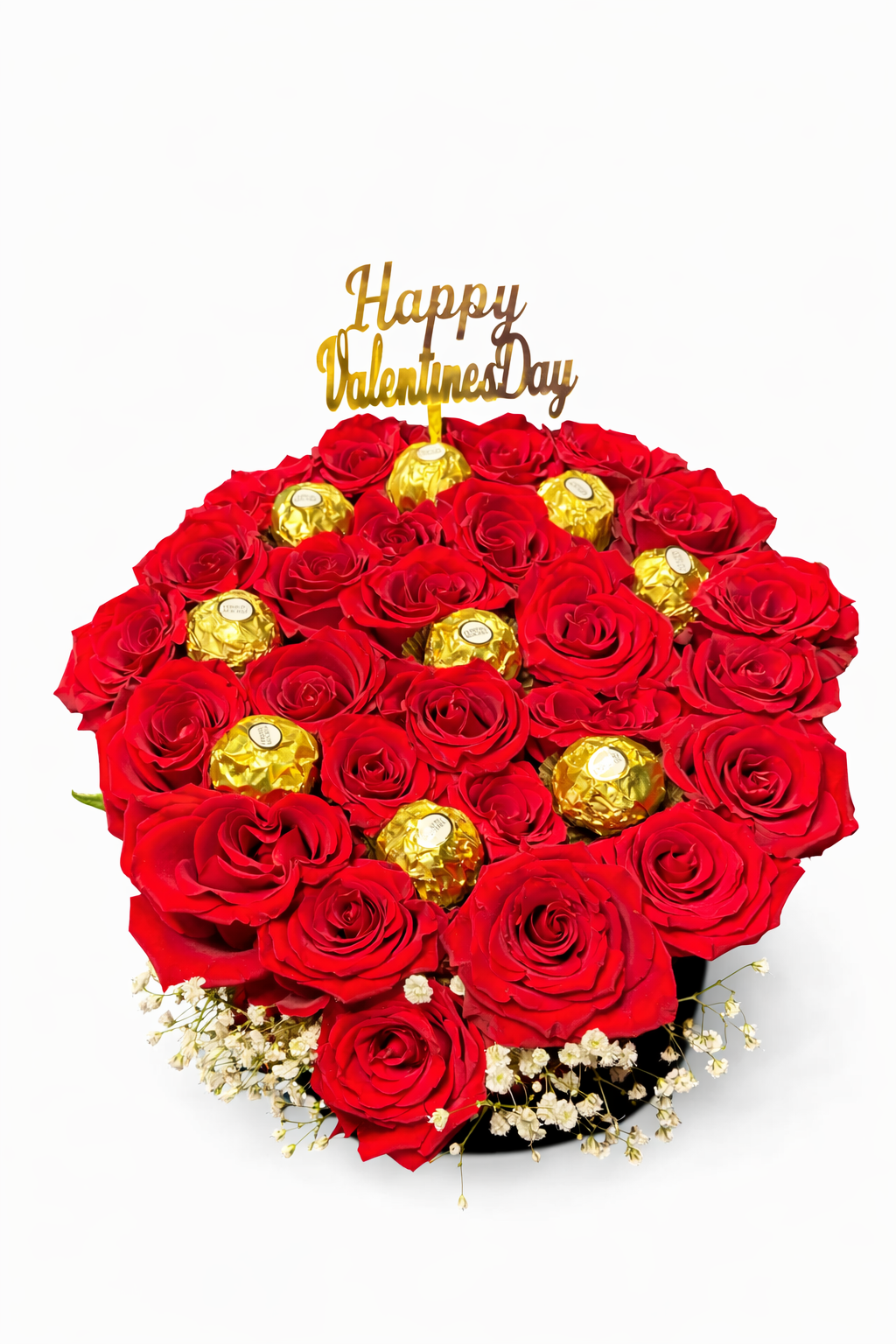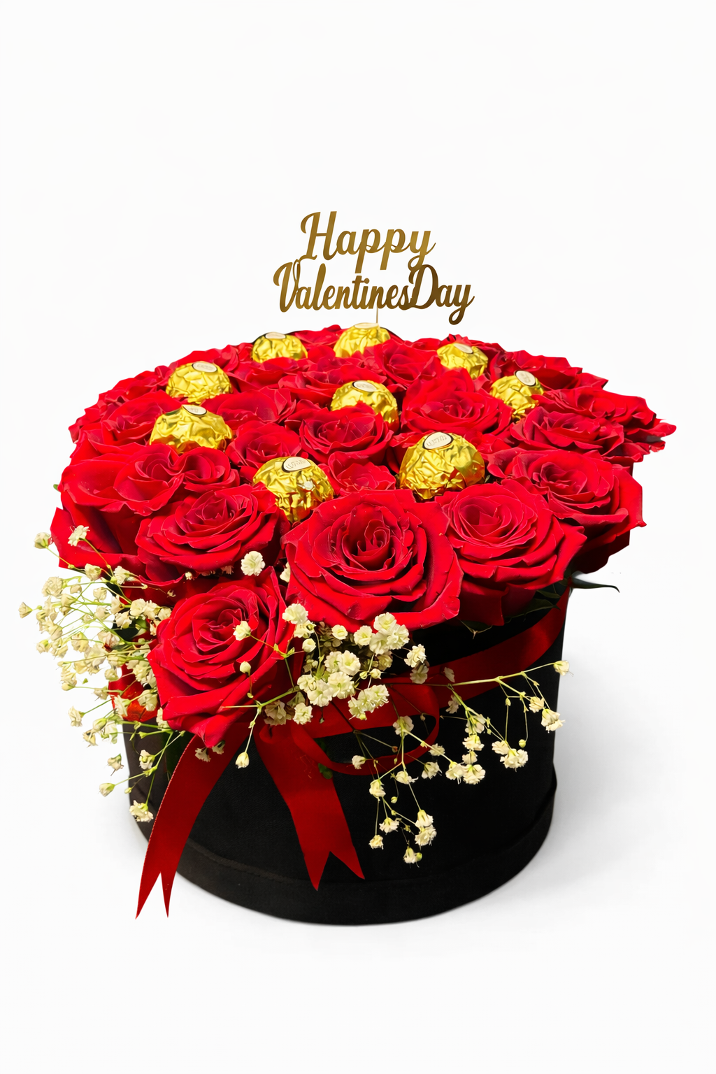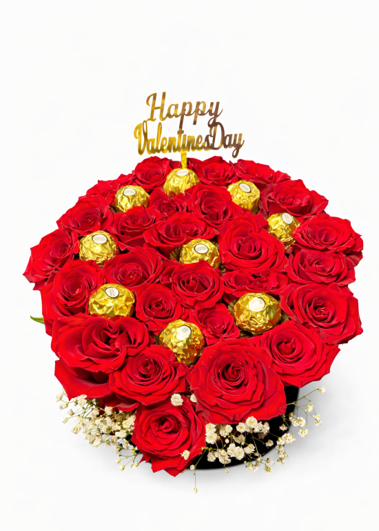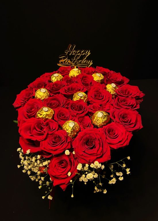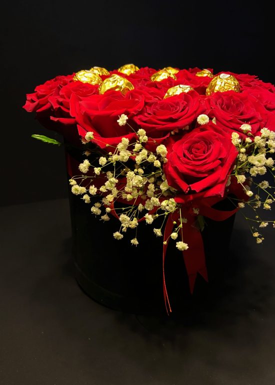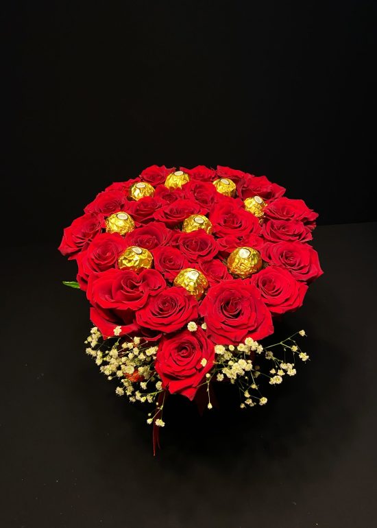 It was prepared in a velvet special box with 21-24 Red XXL roses and 9 Ferrero Rocher Chocolates were added.