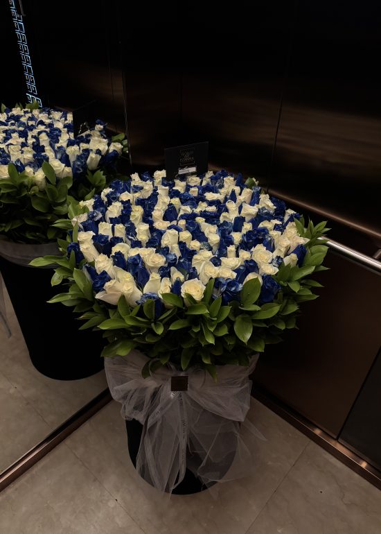A breathtaking display of elegance and harmony — featuring 101 pure white roses and 100 blue-dyed roses, artistically arranged in a luxurious 100 cm box. The unique blue tone is achieved through a gentle spray coloring process applied to natural white roses, creating a sophisticated blend of serenity and depth.