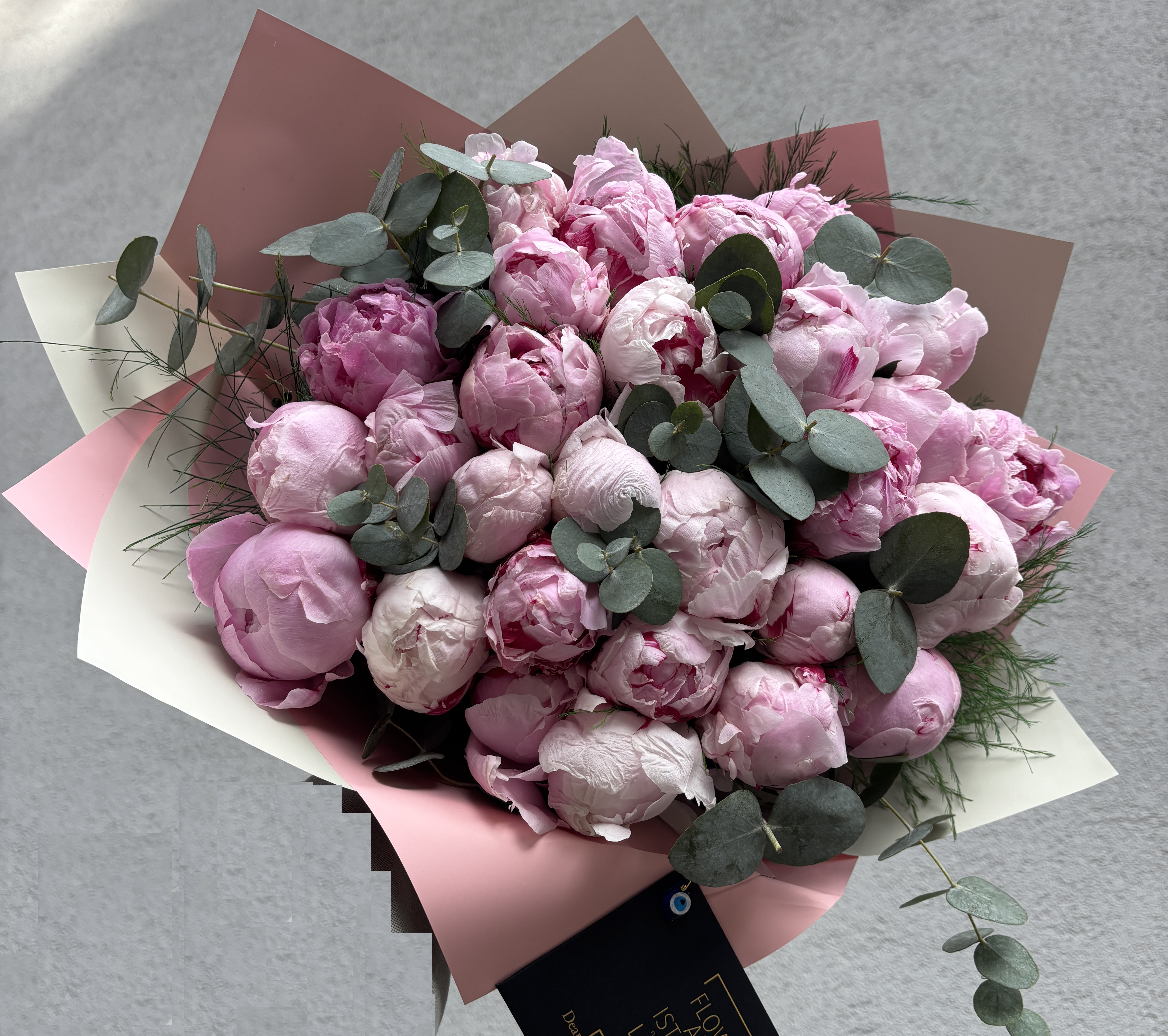 PEONIQ presents 29 premium Pink Sarah Bernhardt peonies — handpicked for their voluminous blooms, silk-like texture, and striking color. A statement of luxury and refined beauty, crafted for those who appreciate the extraordinary.