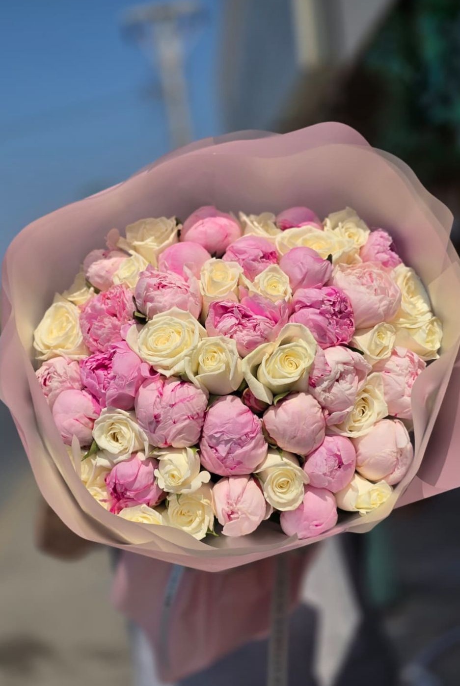 This stunning bouquet features 25 fresh white roses paired beautifully with 25 delicate pink peonies, creating a harmonious blend of softness and sophistication. Each flower is carefully handpicked and artfully arranged to celebrate grace, love, and beauty.