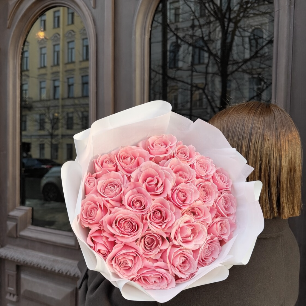 A delicately arranged bouquet featuring 25 elegant pink roses. Each bloom is hand-selected and thoughtfully arranged to create a graceful and romantic presentation. Perfect for expressing admiration, affection, and timeless beauty on any special occasion.