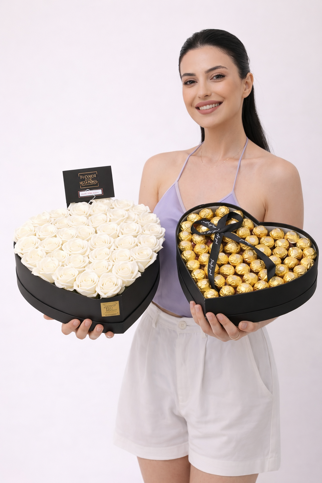 Celebrate your bond with 51 pristine white roses and 51 Ferrero Rocher chocolates, each elegantly arranged in a premium heart-shaped box. A perfect blend of pure elegance and golden sweetness for those who deserve the best.