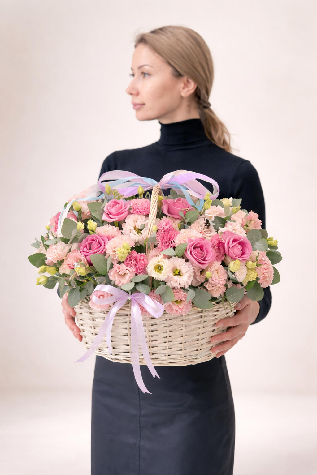 With its pastel color palette and timeless basket presentation, this design offers a warm, feminine, and sophisticated floral style that leaves a lasting impression.