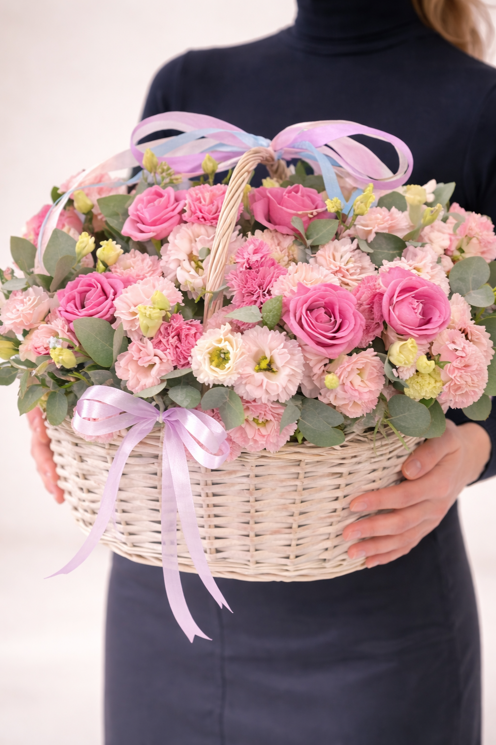 Basket of Pink Dreams is a soft and elegant floral arrangement prepared with pink roses, soft pink lisianthus, and fresh eucalyptus in a charming white wicker basket.