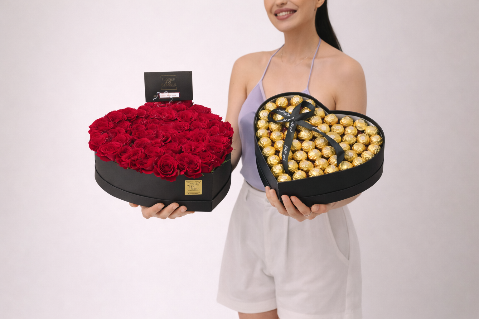 Both arrangements are prepared in heart-shaped boxes of the same size.