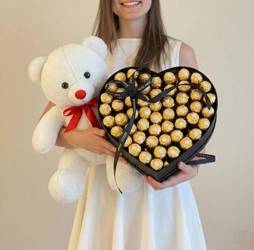 50cm white bear with red ribbon and a heart-shaped box carefully filled with 48-51 Ferrero Rocher chocolates, this elegant gift is perfect for adding a sweet touch to your special occasions. It’s a wonderful choice to bring joy to your loved ones and create an unforgettable surprise!