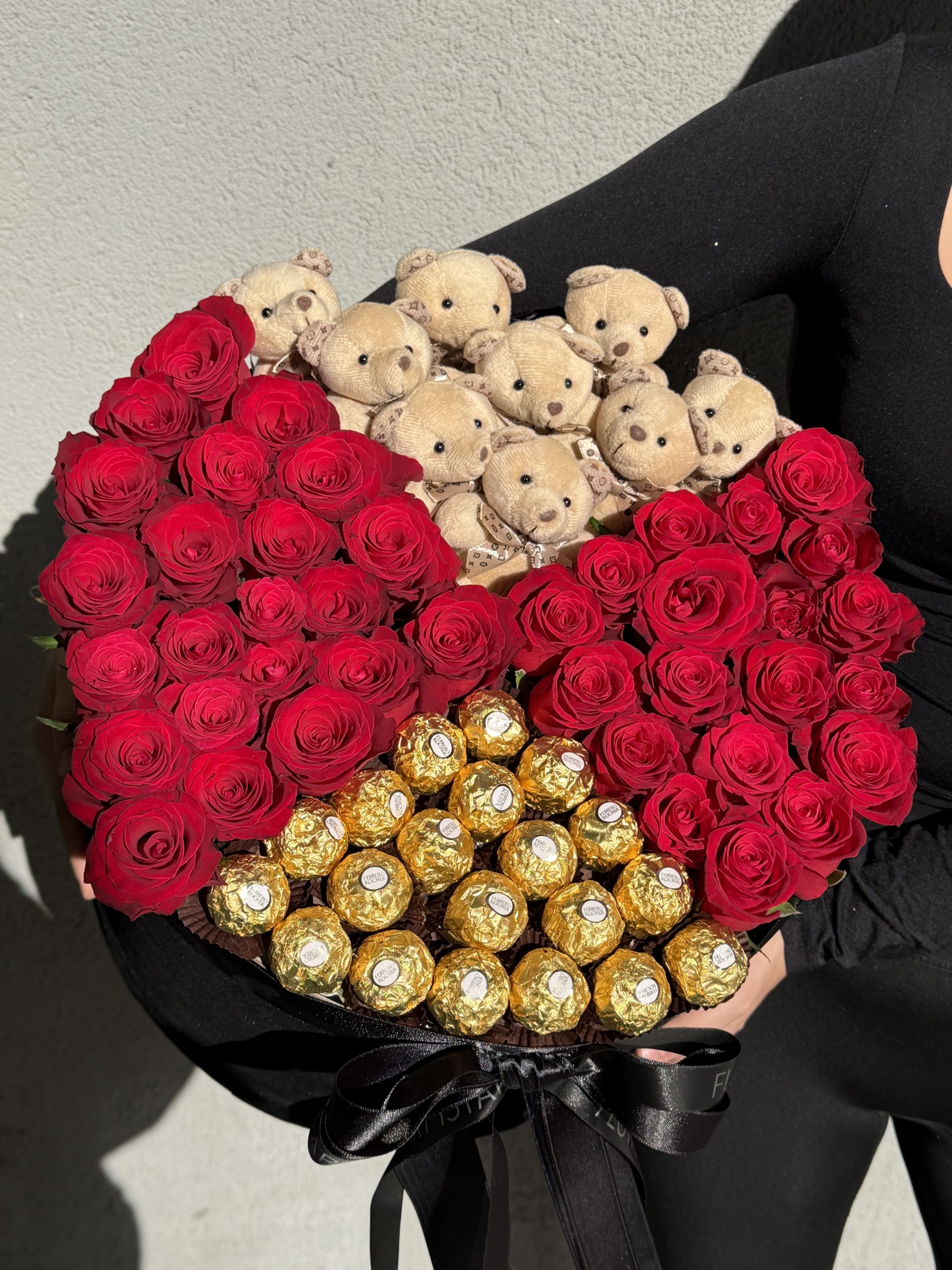 Combining the sophistication of velvet, the enchanting beauty of red roses, the cuteness of mini bears, and the irresistible taste of Ferrero, this magnificent love box is designed to create an unforgettable surprise for your special someone.